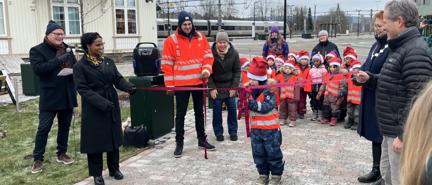 Åpningsseremonien fikk en kreativ vri, der fire personer fra Innlandet fylkeskommune, Bane Nor, Kongsvinger Kommune og Statens Vegvesen holdt båndet mens ett barn fra Langeland barnehage fikk æren av å klippe.